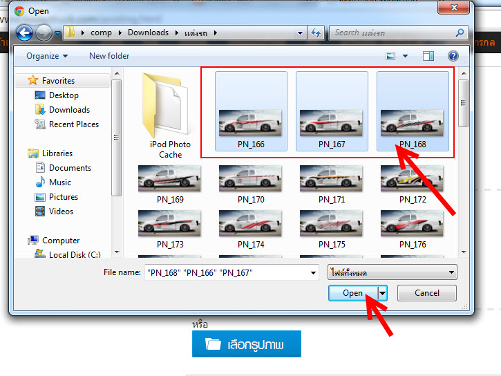 2. ทำการเลือกรูปภาพสินค้าที่ได้เตรียมไว้ครับ สามารถเลือกได้มากสุด 8 ภาพและเลือกทีละหลายๆภาพในครั้งเดียวก็ได้นะครับ